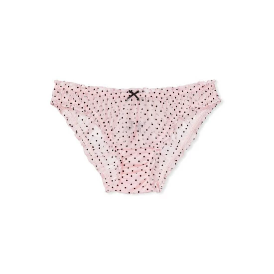 Your everyday underwear options just got flirtier. This delicate cheekini features flocked polka dot mesh and ruffled edges. Kissed with sweet bows down the back. Low rise. Moderate back coverage: shows a little, but not all. Cotton panel gusset. Ribbon bow accent.