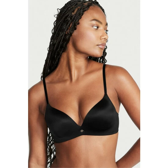 Glamour without sacrificing comfort. Introducing the wireless version of our popular So Obsessed Push-Up Bra. Memory Fit padding provides 1 ½-cups lift and shape. Featuring silky-smooth fabric for a seamless look from cup to band. Wireless. Medium Lift. Push-up padding adds 1½ cup sizes. Fully adjustable, convertible straps. Back hook-and-eye closure. Plunge neckline. One piece of fabric from cup to wing provides a seamless look. Gold-tone VS logo charm at center front.