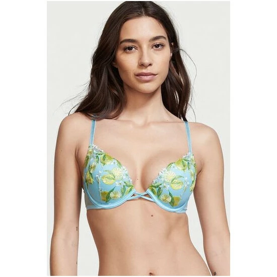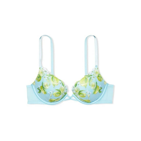 Our dreamy new collection is ripe for the picking, embroidered with delicate fruit stitched by hand. This romantic push-up is kissed with sweet lemon appliques on fine tulle. It combines the confident lift you love with a plunge neckline and pretty, twisted ribbon detail between the cups. Push-up padding. Underwire. Adjustable straps. Back hook-and-eye closure. Fruit embroidery on tulle. Twist-front lace-up detail. Partially made with recycled materials. Hand wash.