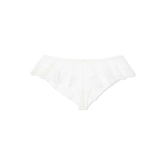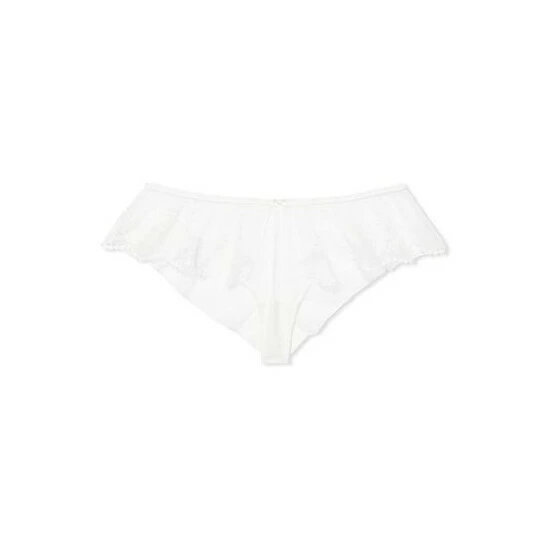 Say “I do” to an exquisite, lace-trimmed style in softly ruched chiffon that floats over curves. ; Low rise Chiffon with lace trim Small decorative ribbon at front; Minimal back coverage, lots of cheek peek Cotton panel gusset Machine wash Imported