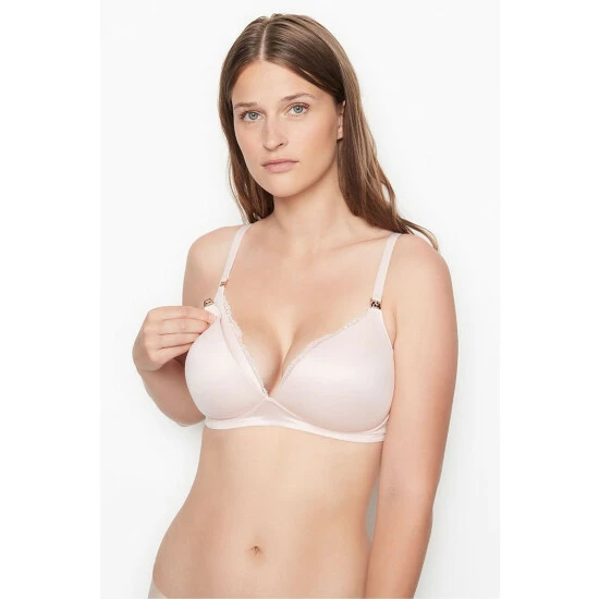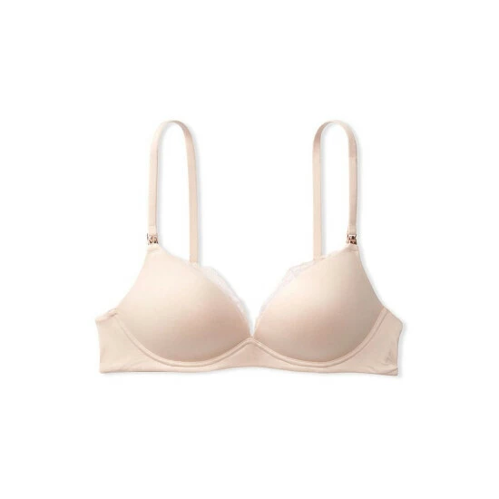 The Body by Victoria comfort and look you love now made for nursing. Ultra soft fabric;offers supreme comfort while still supporting your curves while lace details add a feminine touch. Lightly-lined. Wireless. Fully adjustable straps. Back hook and eye closure. Clip cups fold down for easy nursing or pumping. Leak-resistant and absorbent pad. Lace trim at cups. Hand wash.