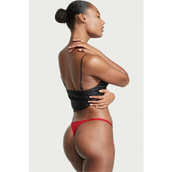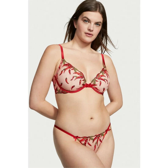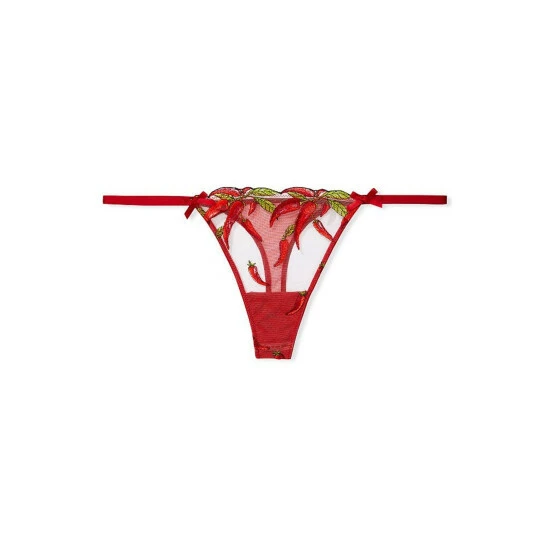 Coming in hot. This sizzling thong is spiced up with hand-stitched chili peppers embroidered on fine tulle. Low rise. String waist. No back coverage. Chili pepper embroidery. Lingerie bow accents.