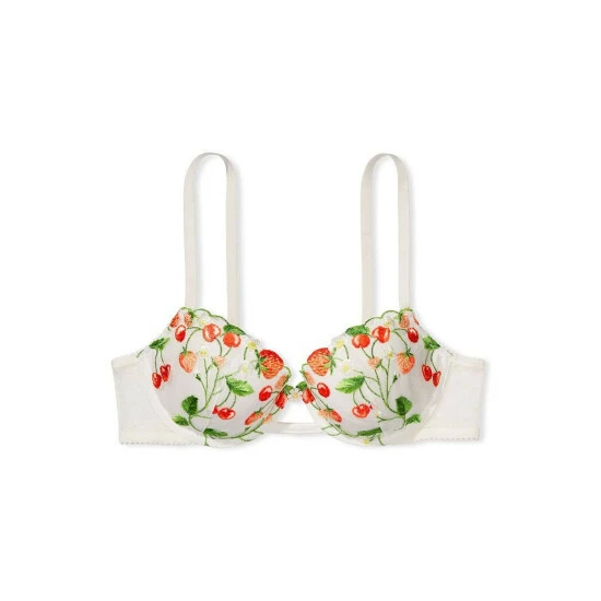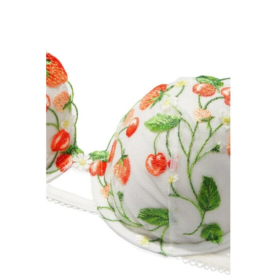 Our dreamy new collection is ripe for the picking, embroidered with delicate fruit stitched by hand. This romantic demi is kissed with sweet strawberry and cherry appliques on fine tulle. It offers the gentle support and shape you love, enhancing your natural cleavage. Finished with scalloped lace cups and pretty, swiss dot mesh sides. Lightly lined. Underwire. Adjustable straps. Back hook-and-eye closure. Fruit embroidery on tulle. Daisy applique at center front. Partially made with recycled materials. Picot trim. Hand wash.