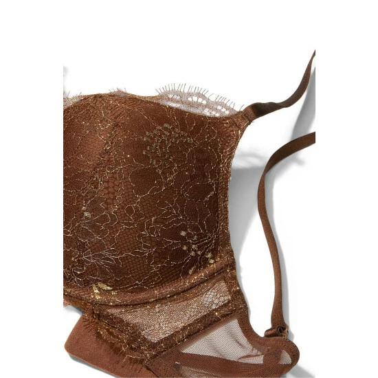 Feel sexier than ever with the plush push-up padding and disappearing infinity edges of this staple bra, finished with allover floral lace cups with gold shimmer and mesh wing. Lift. LininG. Push-up padding adds 1 cup size. Underwire. Straps. Hooks. Fully adjustable straps. Back hook-and-eye closure. Clasps for crossback. Lace accents. Mesh wing.