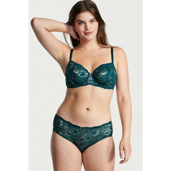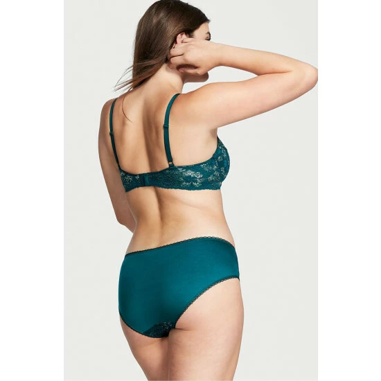 Shimmery blooms are the star of this comfortable hiphugger, featuring a delicate lace front and smooth microfiber in back. Product features a low-rise silhouette with cotton panel gusset and full back coverage: shows curves. Panty offers a picot-trim and lingerie ribbon with logo charm at front. Also partially made with recycled materials!