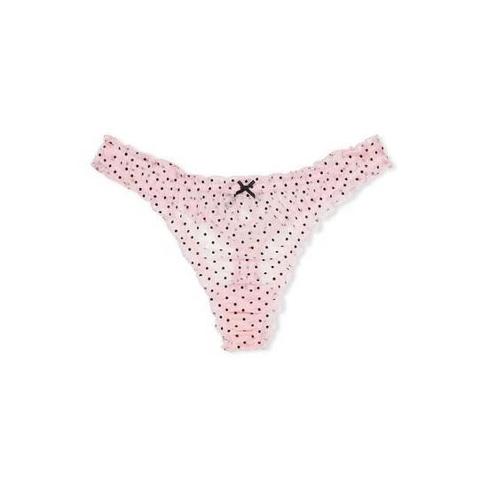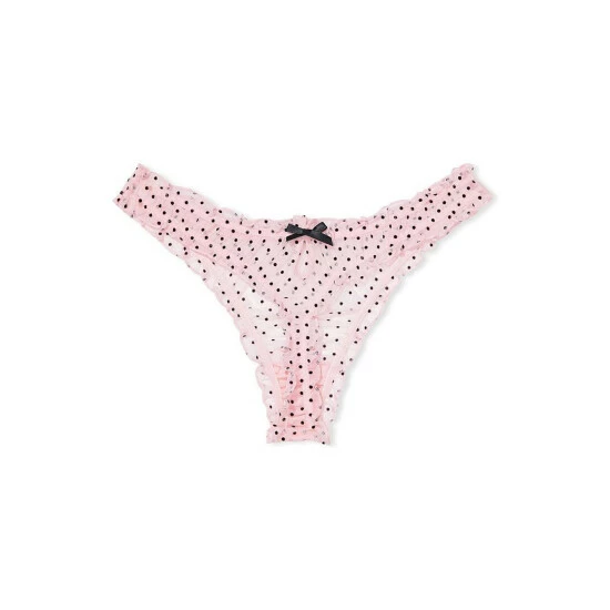 Your everyday underwear options just got flirtier. This delicate thong features flocked polka dot mesh and ruffled edges. Low rise. No back coverage. Cotton panel gusset. Ribbon bow accent.