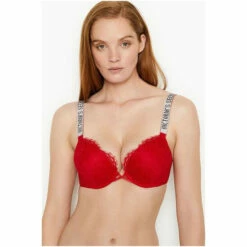 A little;bling;and a lot of;lift, this lace-laden bra gives your curves a boost with details that dazzle. Lift ; Lining Maximum lift (adds 2 cup sizes) Underwire Straps ; Hooks Adjustable straps Back hook and eye closure Details ; Fabric Rhinestone logo shine straps Hand wash Imported.