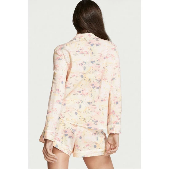 Top priority: everlasting comfort. This supersoft modal PJ set features a button front, chest pocket, notch collar and decorative piping.; Easy fit Light, easy and ultra-soft modal with a touch of stretch Long-sleeve, button-front top hits at hips Top with rounded hem Short with drawstring tie waist 3″ inseam Machine wash Imported