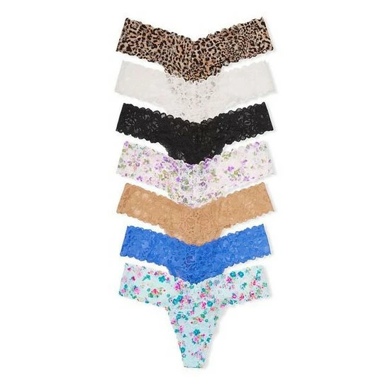 Treat yourself to a bundle of our best-selling, stretchy lace thongs for every day of the week. Fall in love with their comfy, no-show fit and the variety of new colors and pretty prints. 7 per pack. Low rise. Stretch lace waistband and trim. Stretch lace lays flat for no show-through. Cotton panel gusset. No back coverage.