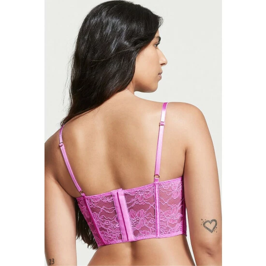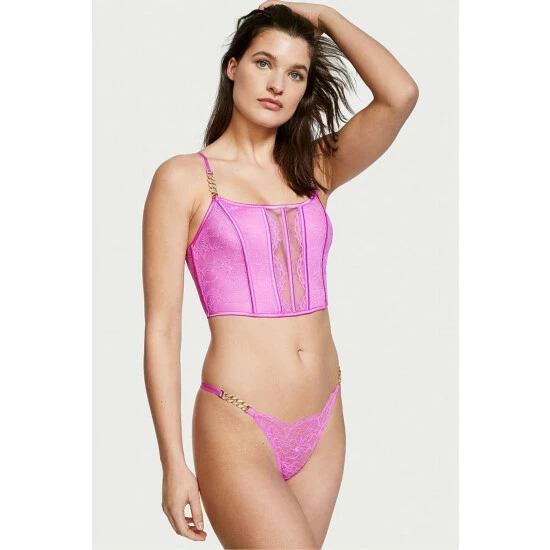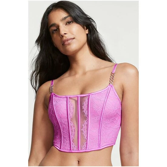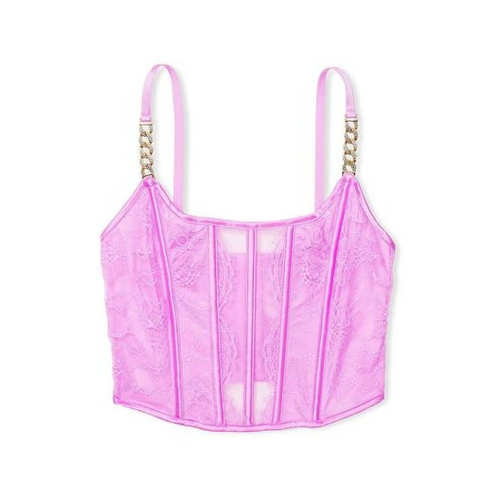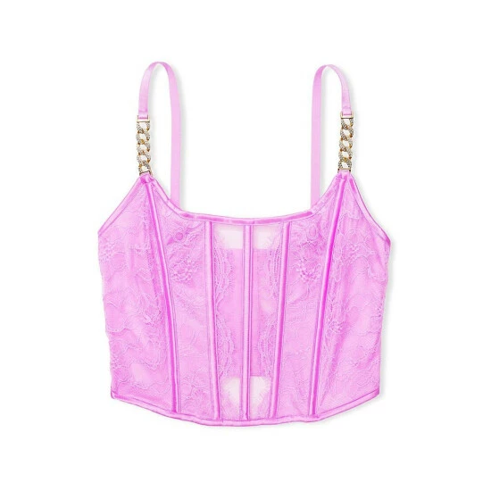 Guaranteed to cause a chain reaction. This; flawless bustier combines luxe lace, sheer mesh, and satin trim with shape-enhancing boning throughout. Chunky gold link straps lend a glam edge to the corset- wear in or out. ; Lift ; Lining Unlined Underwire ; Straps ; Hooks Adjustable straps; ;Back hook-and-eye closures ; Details ; Fabric Allover lace Gold chain trim at straps Boning throughout; Hand wash; Imported