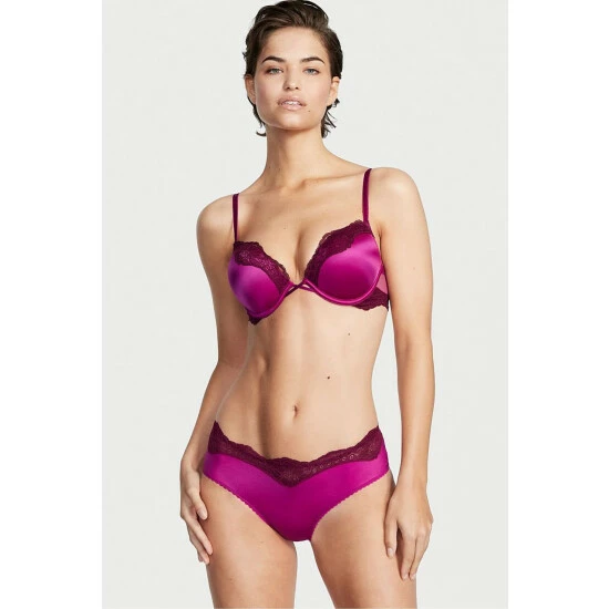 Silky-smooth fabric in brilliant jewel tones is trimmed with contrasting Chantilly lace at the waist. Made to pair with the matching bras. Low rise. Stretch lace waist. Cotton panel gusset. Moderate back coverage: shows a little but not all. Machine wash.