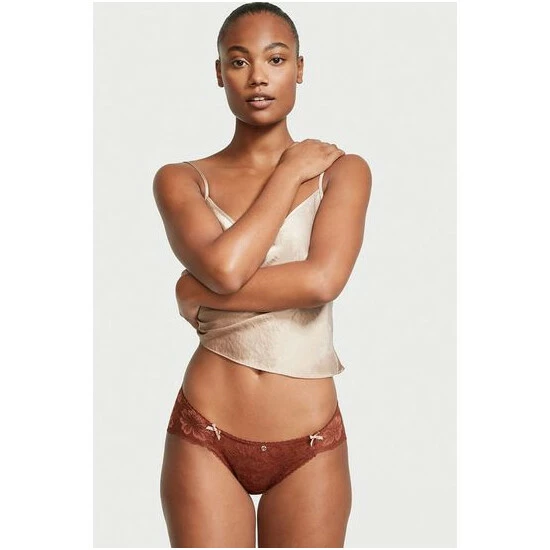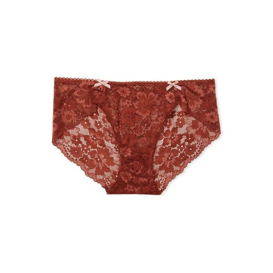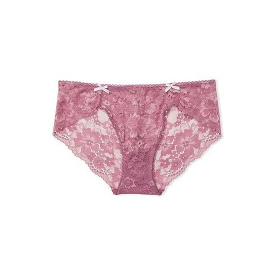 That’s a wrap. Sheer floral lace spans the entirety of this full-coverage silhouette, complete with an elastic picot waistband, lingerie bows, and a gold-tone logo charm. Low rise. Lace lays flat for no show-through. Elastic picot waistband. Pure cotton panel gusset. Full back coverage: shows curves, not skin. Lingerie bows at hips. Logo charm at center. Partially made from recycled materials.