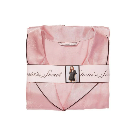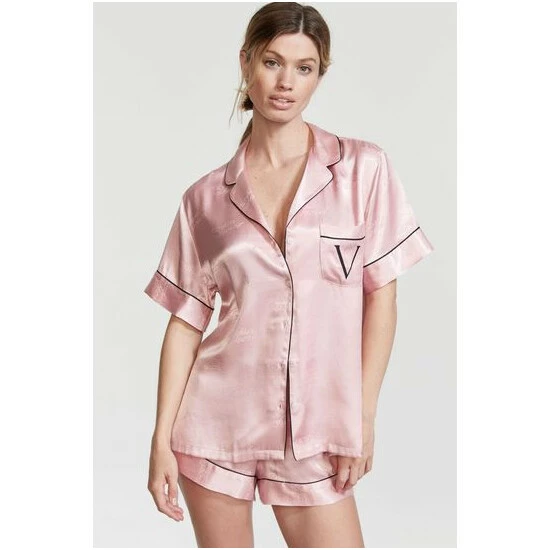 Bring a little comfort to bedtime with this menswear-inspired satin PJ set. Signed with our statement script logo all over. Easy fit; Short-sleeve, button-front top hits at hips. Top features a notch collar, pockets and decorative piping. Our V logo at front pocket. Our script logo all over. Pant with elastic waist. Short: 30 inseam, Regular: 32 inseam, Long: 34 inseam.