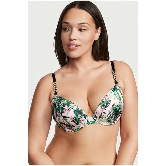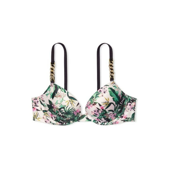 Guaranteed to cause a chain reaction. The latest way to wear our #1 push-up features straps embellished with chain link trim, which adds a glam touch of bling to this glossy satin style. New hardware details, same plush padding-now softer than ever for the lift and natural cleavage you love. Lift ; Lining Push-up padding adds 1 cup size; Underwire cups Straps ; Hooks; Adjustable straps; Double row of hook-and-eye back closures Details ; Fabric Plunge neckline Embellished chain shine strap detail Hand wash; Imported